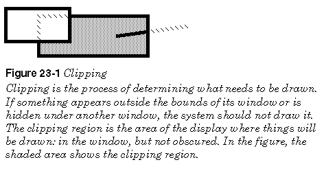 is the process of keeping track of what things drawn to a window are actually visible. If a geode draws something beyond the edge of a window, the system can't just ignore the drawing, as the user might later reveal the drawing by scrolling onto that area. The graphics system "clips" the graphic, being sure to show only those parts that are in the visible part of a window. Further clipping takes place when a window is obscured behind another window. Any drawing on the lower window must not show up until the upper window is moved. The "clipping region" is that area of a window which is visible--anything drawn to the window outside the region will be clipped (see the figure below). Programs can reduce the clipping areas of any of their associated windows.