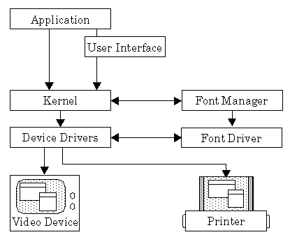 Commands and information flow in this manner from application to the Video Device, though information also flows in the opposite direction, so that the kernel can get information about the display device's resolution, size, and capabilities.