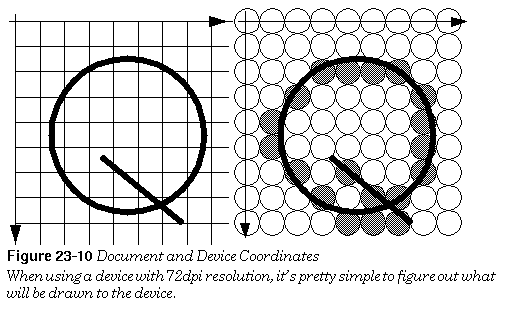 Consider a device whose pixels are exactly 1/72nd of an inch, such that no scaling is required to map document units to device units. The relationship of the coordinate systems is illustrated below. Note that a pixel falls between each pair of document units. This is a further demonstration of the concept that document coordinates specify a location in the document coordinate space, not a pixel.