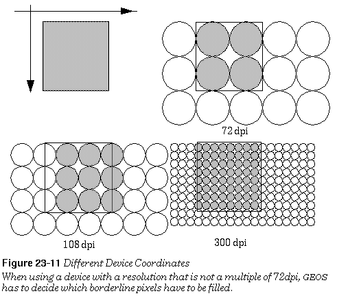 These rules might seem a little odd: Why not just fill all the pixels that would be touched by the area? One of the problems with this approach is that areas that did not overlap in the document space would overlap on the device. Or more specifically, they would overlap only on some devices (depending on the resolution), which is even worse. The rules have the property that adjoining areas in document space will not overlap in any device space.