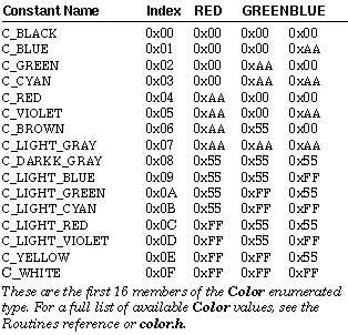 Other Color values include a 16-shade gray scale (the C_GRAY_...entries), some "unused" entries (the C_UNUSED_... entries), and a number of entries which have been set up to allow you to specify a color by its red, green, and blue components on a zero-to-five scale (the C_R..._G..._B... entries).