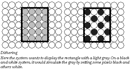 Not all users have video devices which can display 256 colors at a time. Even fewer have printers capable of doing so. Therefore, the graphics system makes allowances for drawings which use unavailable colors. Exactly what the system will do with an unavailable color depends on the color mapping mode used. By default, the system will choose the two (or more) closest available colors and dither them together in an attempt to form a mixture which will appear to be the correct color overall when seen from a distance.