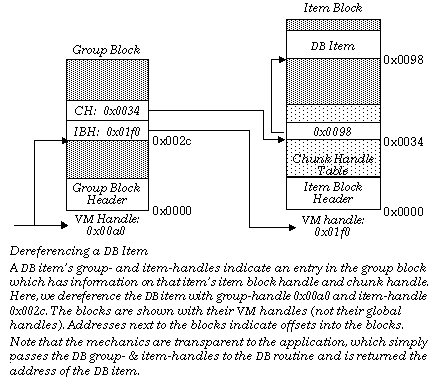 The item's group-handle is simply the VM handle of the group block for that group. The item's item-handle is an offset into the group block; the information about the item is stored at that offset. When you lock an item, the DB manager looks in that location in the group block and reads the handles of the item block and the chunk associated with that item; it then locks the item block and returns the address of the chunk. (In assembly code, it returns the segment address and the chunk handle.) The relationship between the different blocks and handles is shown in the figure below.