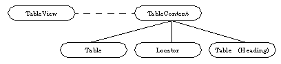 The TableContent object manages the dispatch of keyboard events to its Table anTableView object, and acts as the bridge between the generic and visual object hierarchies. The hierarchy of this arrangement is shown below: